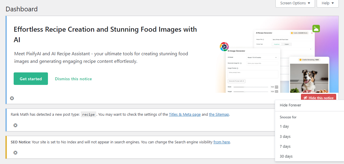 - Or hide/snooze individual notices as they appear on your dashboard.