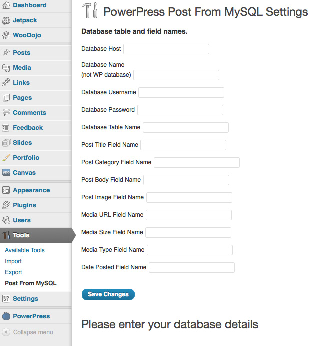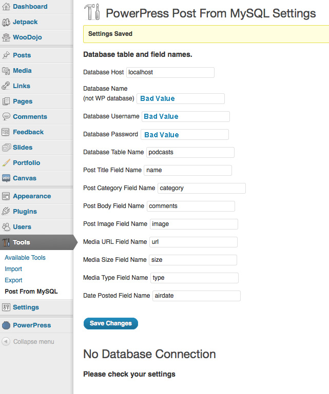 - Configure your database settings in Post From MySQL under the Tools menu in the Dashboard and click Save Changes