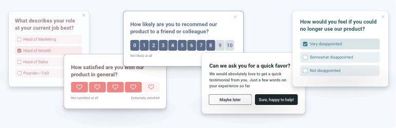 With Refiner you can ask your users any question while they are using your app or browsing your website. Measure customer satisfaction (CSAT), Net Promoter Score (NPS), or customer effort score (CES), research what to built next or profile your users. Refiner supports all survey use cases and comes packed with expert-built templates that will get you started quickly.
