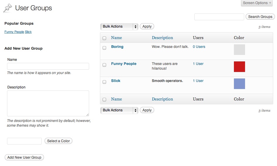 Works beautifully with the Rich Text Tags plugin for adding WYSIWYG descriptions to the User Groups.