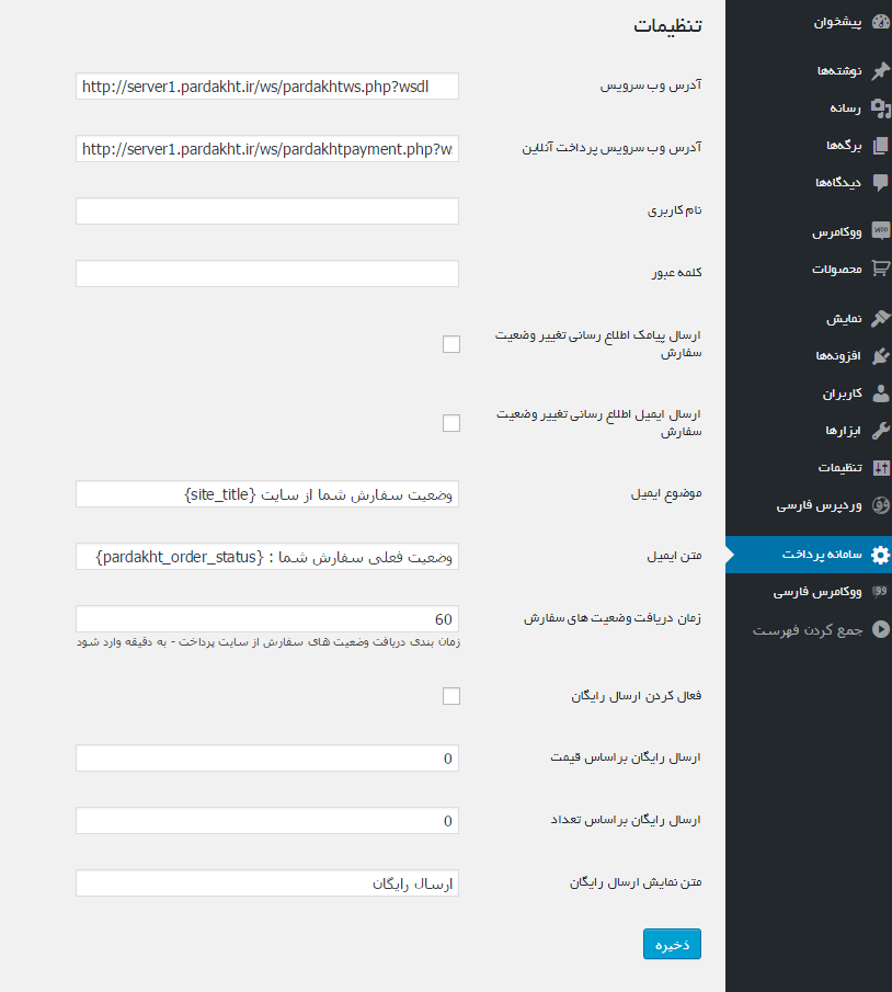 pardakht-woocommerce.zipto the ‘/wp-content/plugins/’ and extract it - Activate the plugin through the ‘Plugins’ menu in WordPress