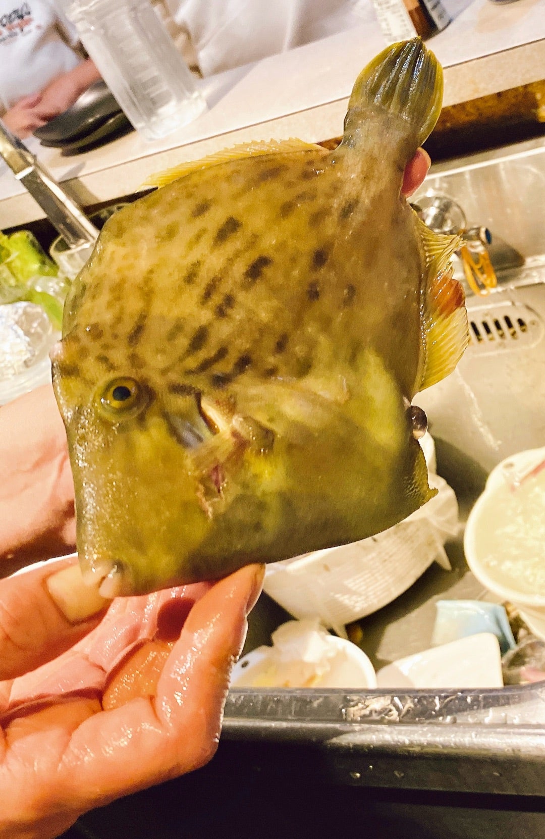 釣れたてのカワハギ。刺身はその場で捌いてくれます✨