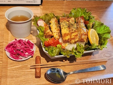 そんななかにあったのが、とんかつプレート(1100円・税込)。とんかつがライスの上に載っているものなんだけども、レタスやミニトマトなどの野菜がしっかり入っていて、メニューを見た感じとても見栄えが良い。