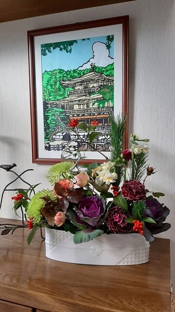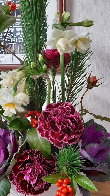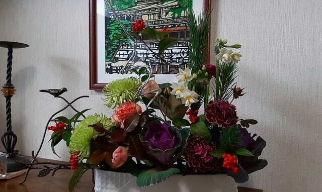 他にも庭の 水仙・千両・丸葉ルスカスや生徒さんが届けてくれた葉ぼたん