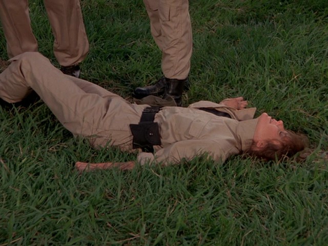 She isn't doing too well at it, and Kincaid is annoyed. He gets Thompson to spray the balance beam with bullets, which startles her and she goes tumbling.