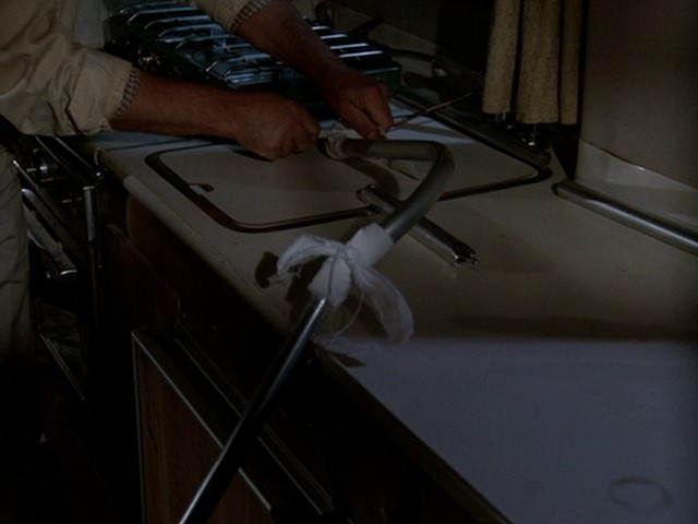He uses this to (I'm guessing here, it's not 100% clear to me) catch gas from the stove in a bottle. He then lights a Coleman lantern, hides in the closet behind the mattress, and tosses the lantern at the bottle. It breaks the bottle and explodes the gas inside it, blowing the door off the camper. Dugan is bruised by the explosion but alive and now free.