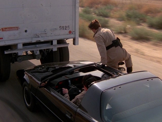 This episode opens in medias res, with KITT flying down the road while Michael and some other dude fight each other in the passenger cabin. They approach a roadblock, where the cops clock KITT approaching at 225+ mph. The police, stunned, get out to watch him.
