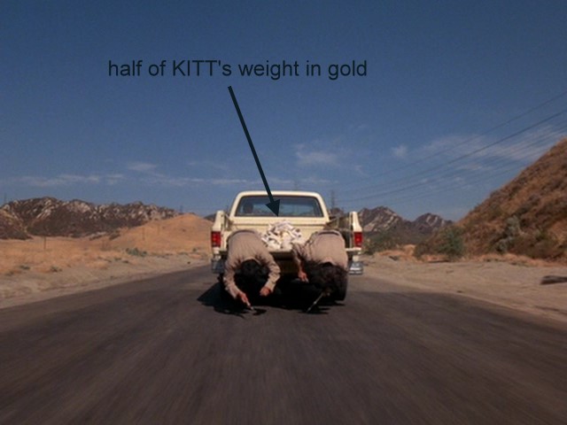 On 11-26-1982, the price of gold closed at $417.75/troy ounce. That means that $12 million in gold would be in the vicinity of 2000 pounds. For comparison, the curb weight of a 1982 Trans Am is 3200 pounds. I generally assume that KITT weighs more than that, given that he is not factory-standard, so let's round it up and say that there is approximately 1/2 of KITT's weight worth of gold in that truck to unload. This gold would have an approximate volume of 12 gallons - doesn't sound like much, but if it were in gallon milk jugs, each jug would weigh a bit over 160 lbs.