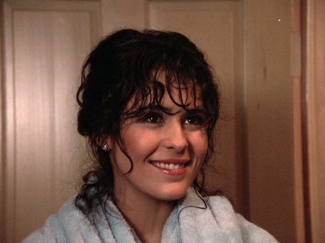 The woman comes upstairs with the harpoon gun, the camera focused unblinkingly on her shiny wet thighs. She walks into the room with Michael and ... nothing happens. He smiles at her, she smiles back, she gets a towel and helps him with his tie, and in an only semi-wooden contextual exchange they establish that Michael is playing bodyguard here and is responsible for preventing her father from being assassinated. This is Maria Elena.