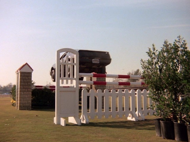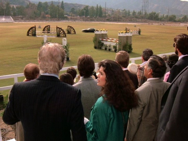 Under prompting, Micki kindasorta remembers something about a "pedestrian show," which Michael connects to the equestrian show. It's odd because neither Burns and del Fuego, nor del Fuego's lackeys in the car, said anything about an equestrian show. No matter! KITT performs a rather sloppy bootlegger turn and they head to the event. KITT attempts to contact Devon but has trouble getting through. They run into a bunch of cars blocking the road and jump the obstruction.