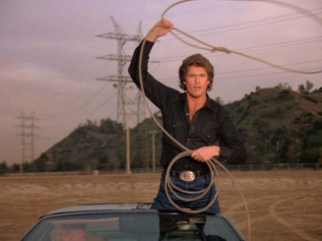 Since she is demonstrably not okay, Michael decides to rescue her. He does this quite hilariously, using some rappelling gear that I reckon he keeps stowed in KITT's back seat.