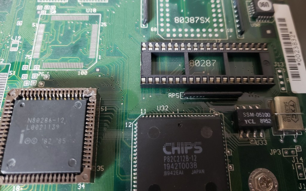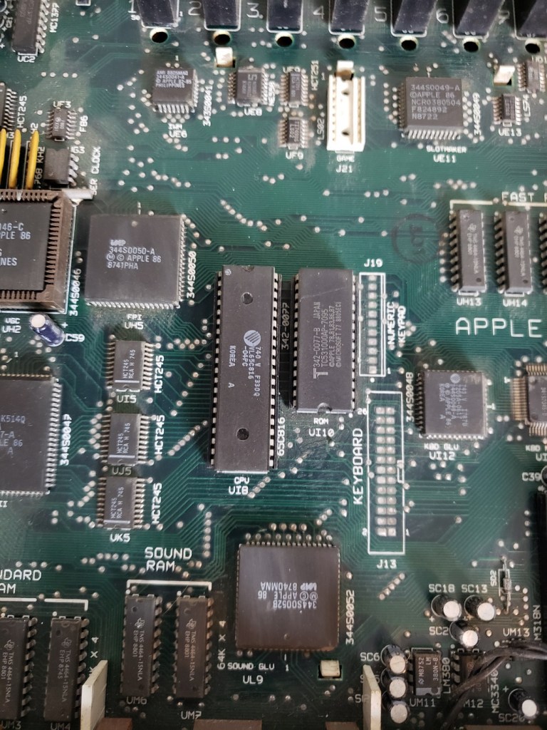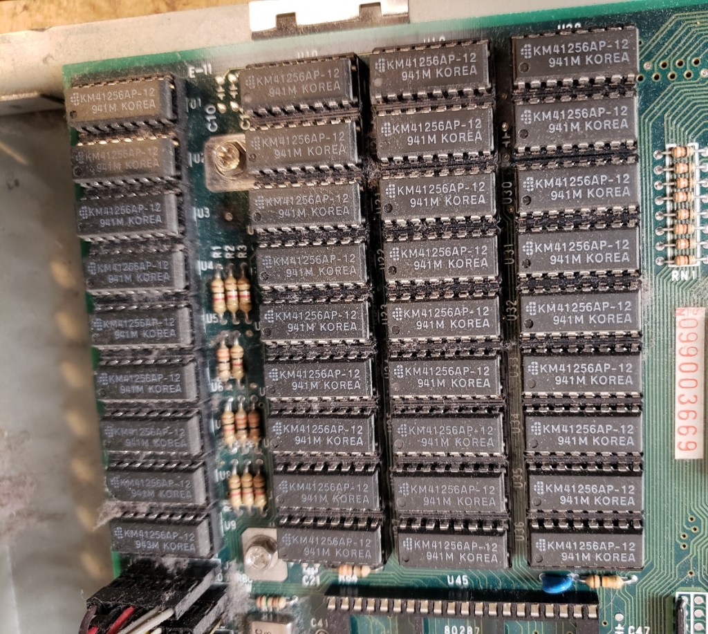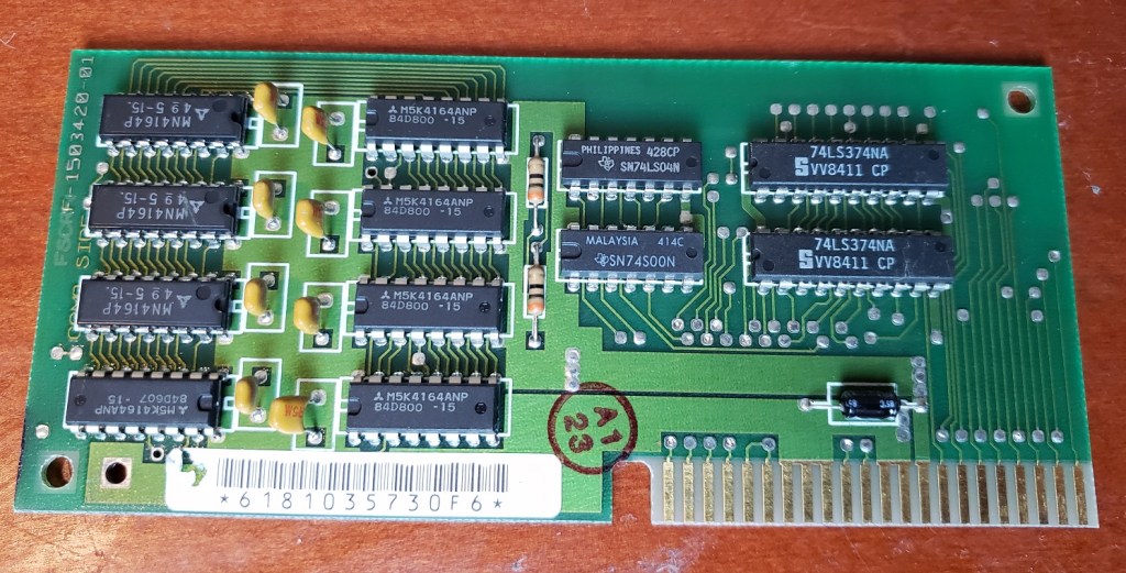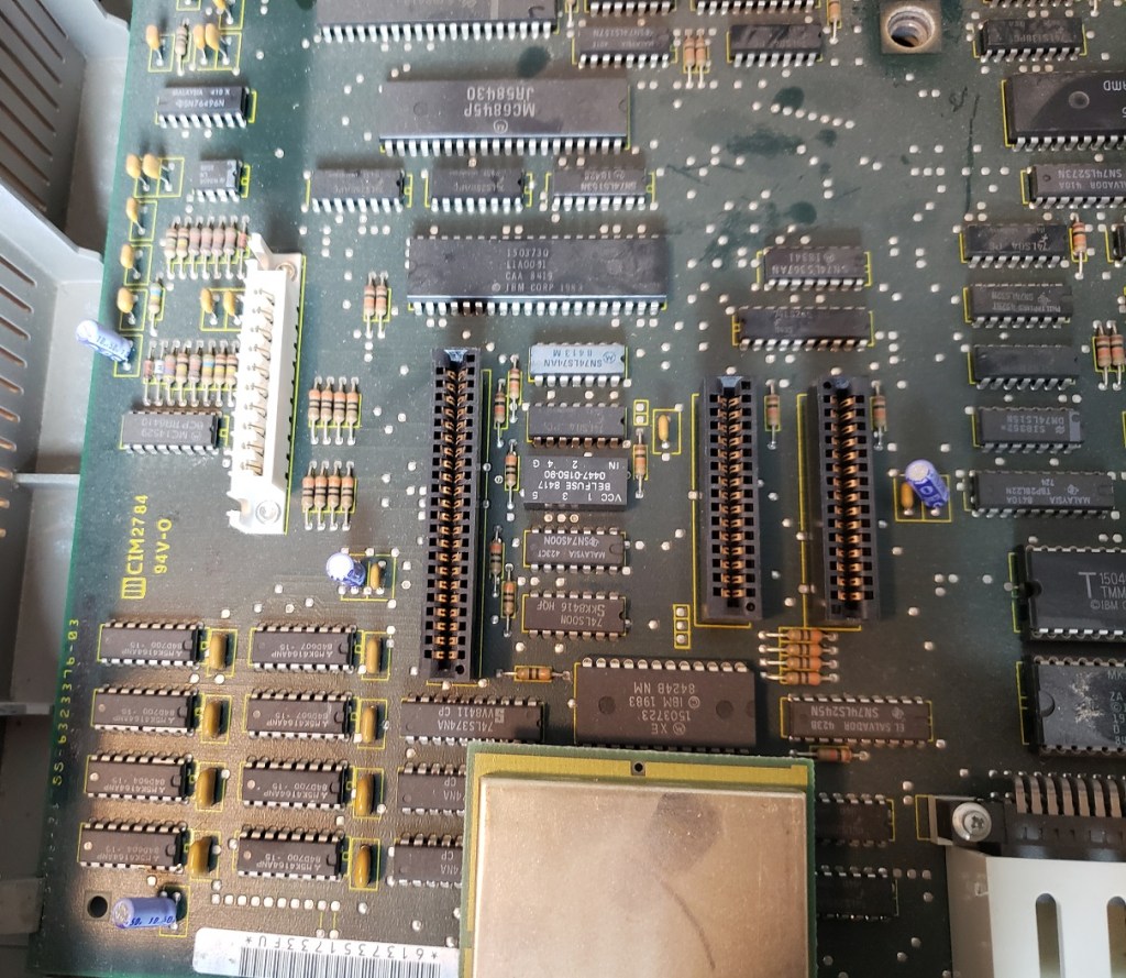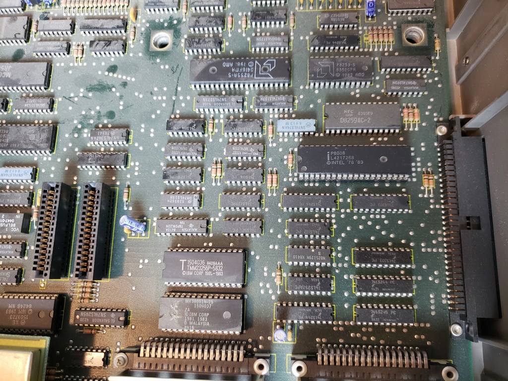 There isn’t a whole lot I’m experienced enough to point out going on inside the PCjr though there are a lot of chips. The Jr does have 64K of memory soldered onto the motherboard though without reading the chips I’m not sure where this is. I would suspect the cluster of “like” chips in the lower left side of the board is the RAM in question. In theory with memory expansion sidecarts the memory should be able to be brought up to a maximum of at least 720K. There is also no socket to add a math co-processor to the Jr though this would be expected as such a luxury would increase the cost and find little use in a computer more focused on the home and less on number crunching business or workstation tasks. The board also lacks a built-in DMA controller.