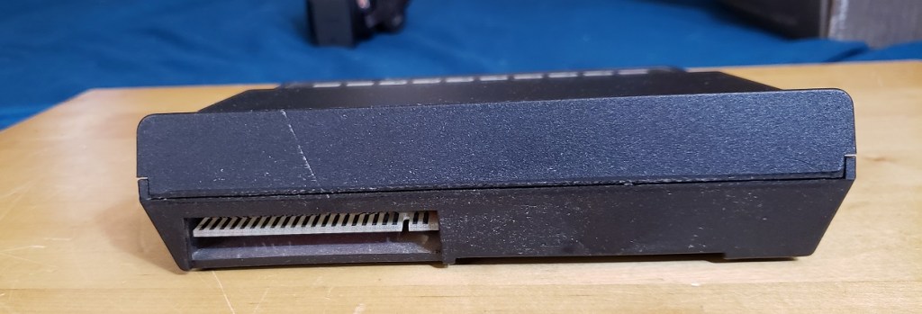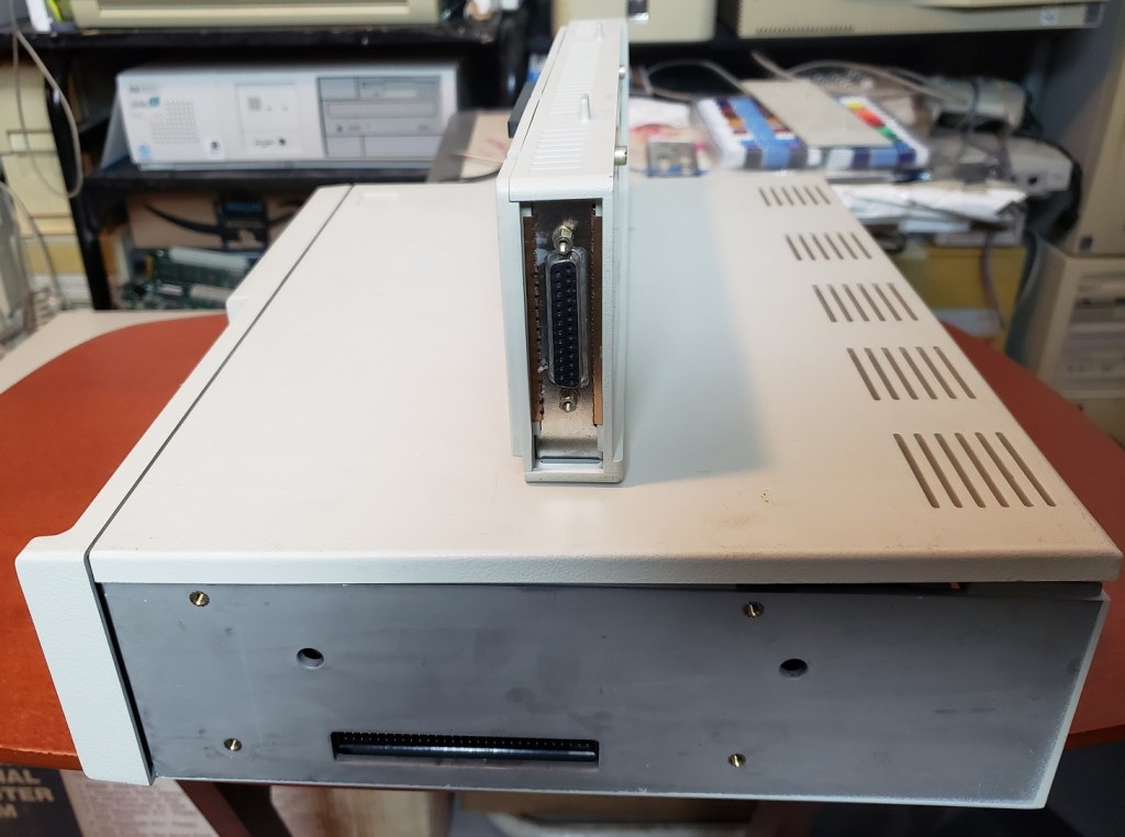Before opening the PCjr I should mention the sidecarts. The primary way in which to expand the PCjr was via a connector located on the side of the PCjr, much like the side connector on the Amiga 500. Any number of sidecarts could be attached and daisy chained thus adding things like standard parallel ports and even memory expansion cards. After about two sidecarts though you would need to attach a special power sidecart which required its own power supply in order to power more cards. It’s pretty easy and convenient when you’re only adding one or two cards but anymore and it starts to be a bit ridiculous.