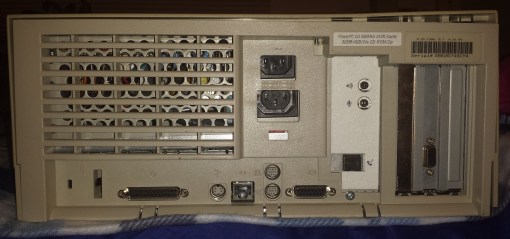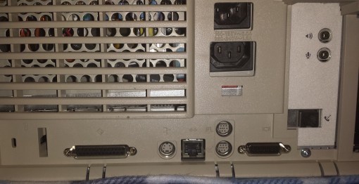We have a power connector and a pass through for a monitor top center and starting at the bottom left we have a SCSI connector followed by a lone ADB port followed by a Ethernet jack and then modem and printer jacks. Lastly we have a display jack for the built in graphics. To the right of the display jack we have another modem jack that my model came with as well as jacks for the audio, a audio out and mic input. This section may vary since it can be swapped out with various “personality cards” which I’ll talk about when we get to the motherboard portion.