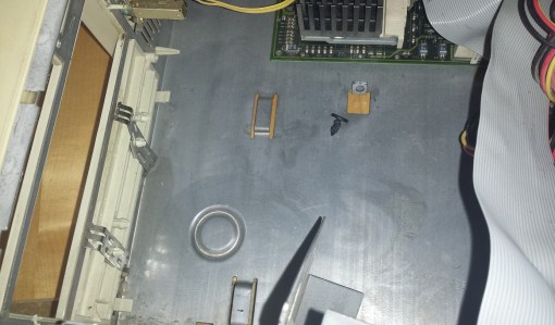 Here is a view of the drive bay assembly removed from the case as well as the hard plastic screw that needs to be removed to get the metal assembly out.