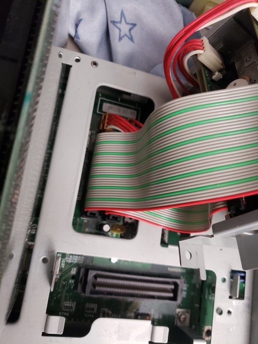 The lower connector is for the CD drive and although it looks like IDE it is NOT. As stated before the connection is a proprietary interface that as far as my research has found no one has made an adaptor to allow more common drives to work with nor were any other CD drives manufactured that used this interface. The CD drive is powered through this proprietary interface. The upper connector is a 50 pin SCSI connector intended for a hard drive although hard drives were not standard for the Towns as most programs were still meant to run from the CD drive. The interesting thing is that even though there is a spot to add a SCSI hard drive there is no molex connector coming off the power supply to power one.