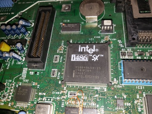 1) CPU – The CPU for the FM Towns SE20 is an Intel 486SX at 25MHz. This is a step up from earlier Towns computers that generally had 386 processors installed. The CPU is directly soldered to the motherboard but upgrading is possible via a CPU upgrade slot located next to the processor.