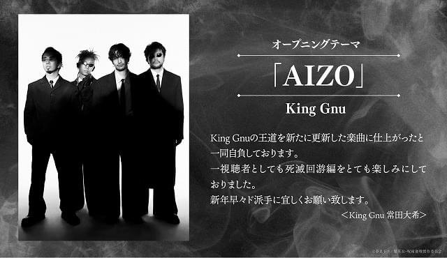 第3期「死滅回游 前編」のオープニングテーマは、「King Gnu」の楽曲「AIZO」に決定した。同曲の一部を収めたPVは、「死滅回游」から本格参戦する呪術高専3年の秤金次と星綺羅羅の姿や、脹相と禪院直哉の戦闘シーン、天使のような姿をした少女の姿を収録。さらに、虎杖と乙骨の死闘、呪術を与えられた者たちの殺し合い「死滅回游」に挑む虎杖と伏黒の姿も映し出す。また、髙羽史彦、日車寛見、レジィ・スターら新キャラクターも登場する。