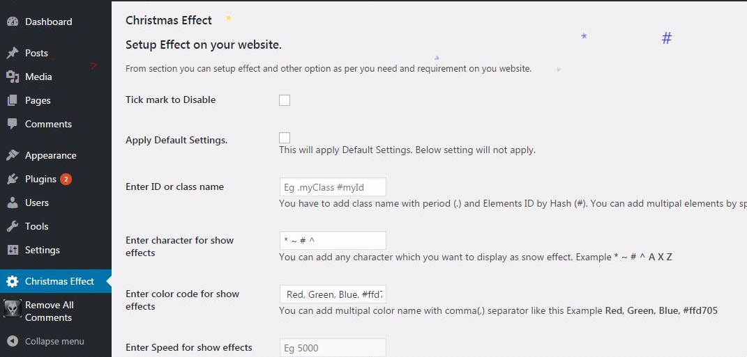 Christmas Effect for wordpress Websiteto the/wp-content/plugins/directory - Activate the plugin through the ‘Plugins’ menu in WordPress.