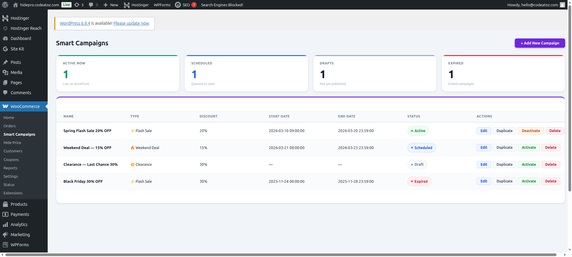 WooCommerce Smart Campaignsand click Add New Campaign. - (Optional) Choose a template at the top (Flash Sale, Weekend Deal, Clearance) to prefill common settings.