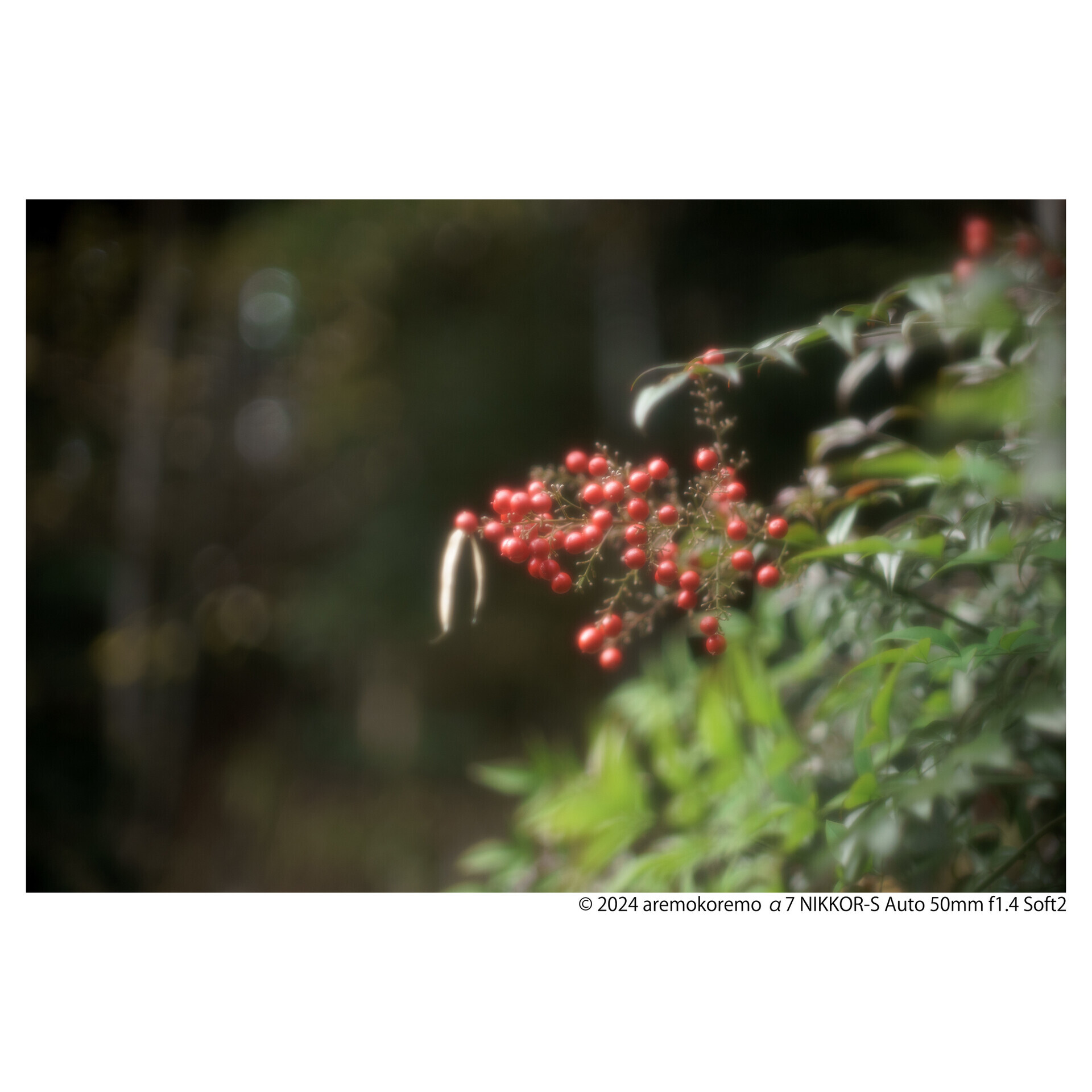 あー、これはいいね、ハマった。南天の実に当たっている光がいい感じに滲んだ。