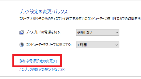 まず、電源オプション -> 電源プラン -> プラン設定の変更とクリックし、「詳細な電源設定の変更」をクリックします。