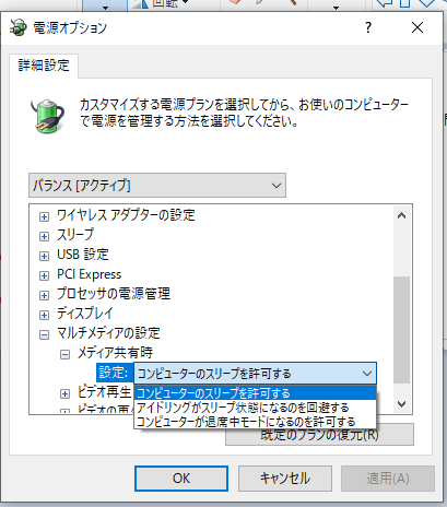 下の方にある「メディア共有時」の設定で「コンピューターのスリープを許可する」を選択します。