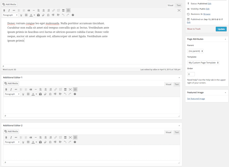 Easiest and mostly configureless way to add additional WP wysiswg editors to any custom page template.