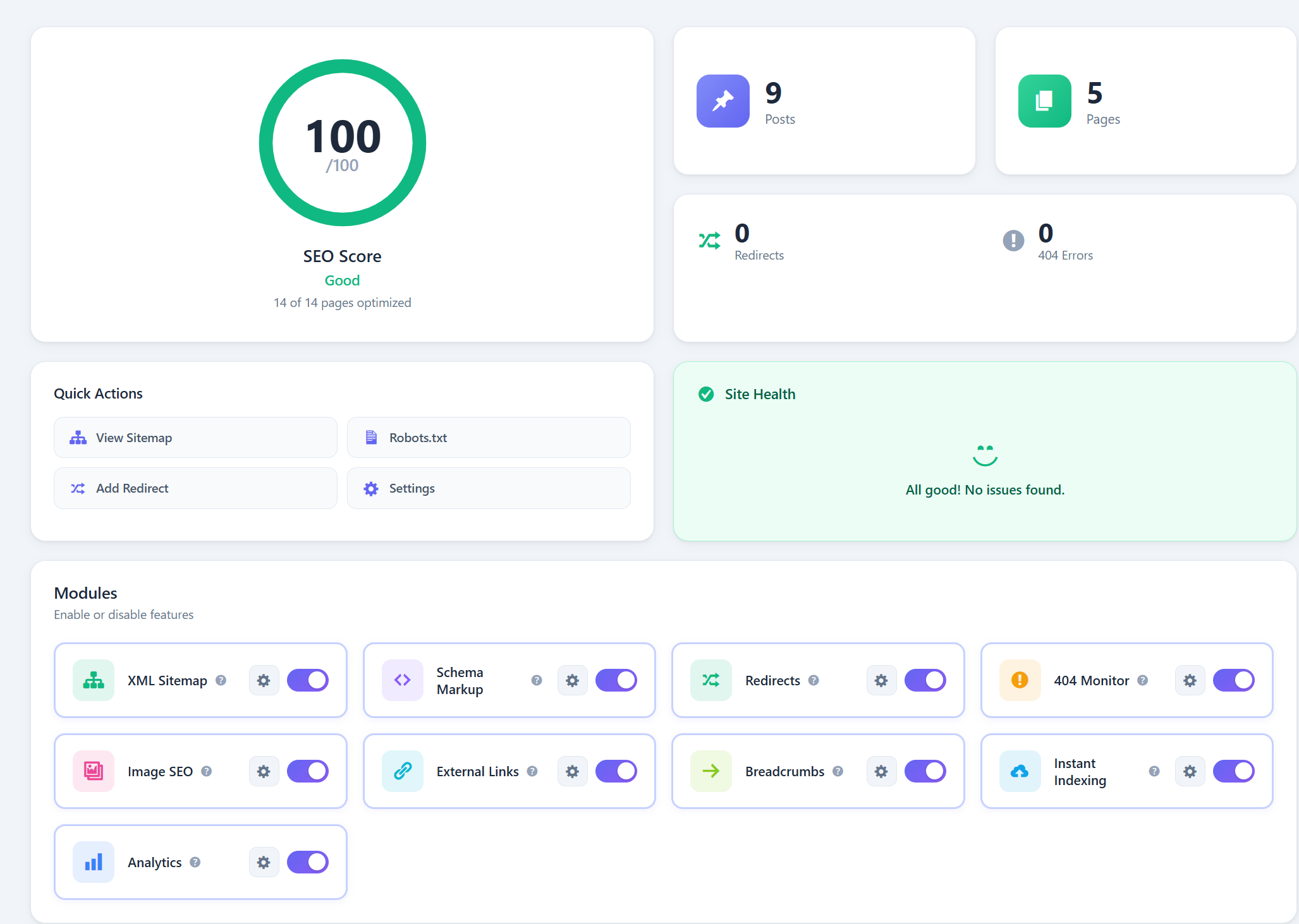 - Feature toggles (Sitemap, Image SEO, External Links, 404 Monitor)