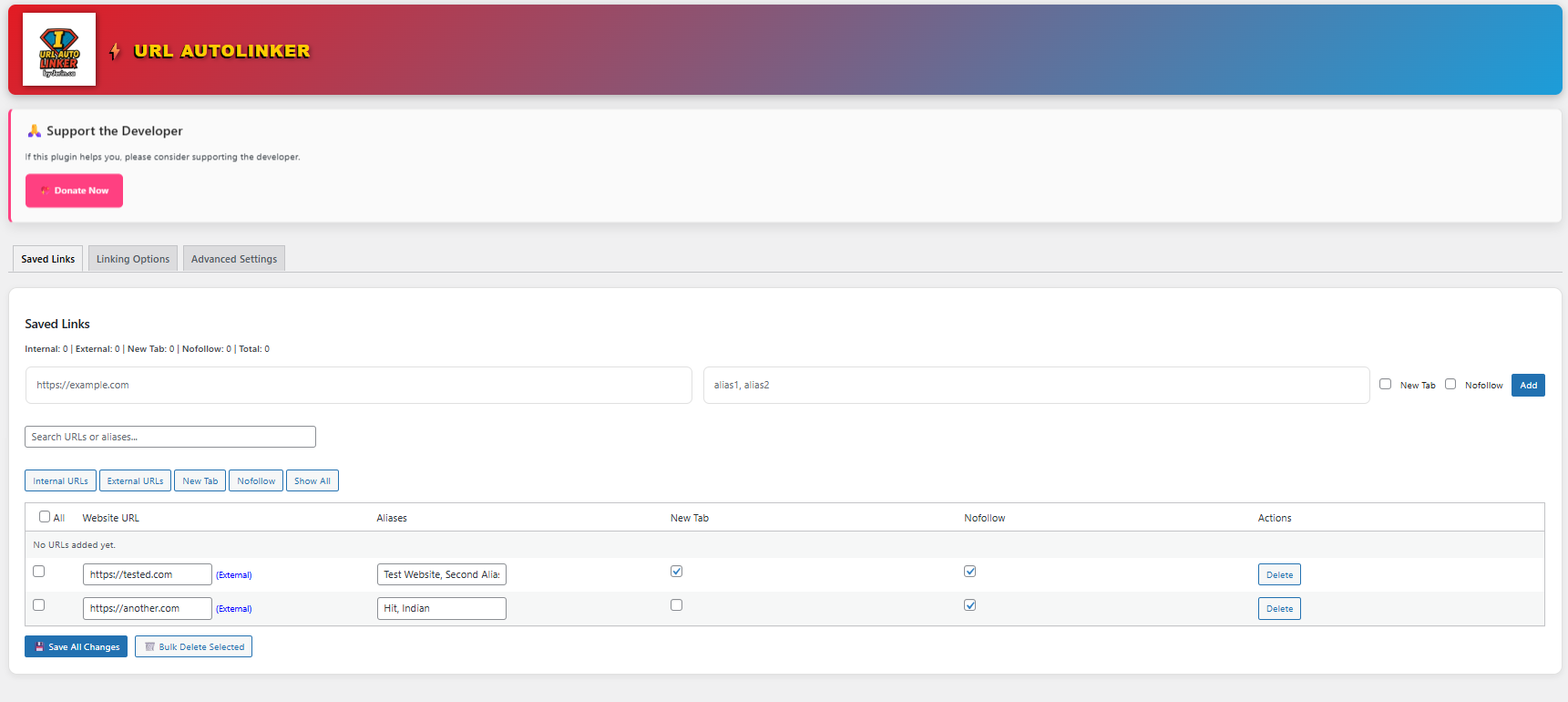 - Add your URLs, aliases, and set your linking preferences (new tab / nofollow / limits).