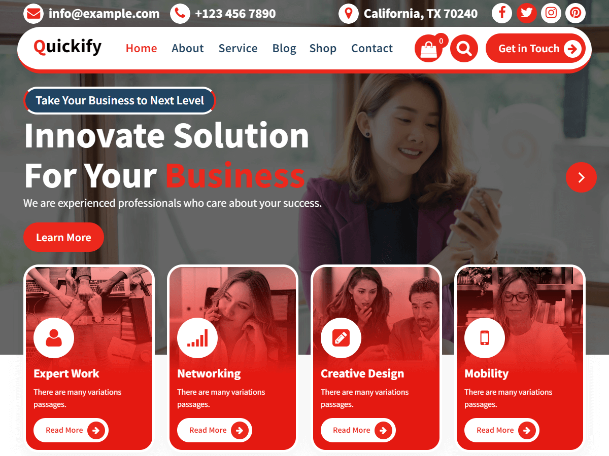 Lightning Fast Speed & Responsive Theme. Quickify is a responsive and fully customizable theme to create any kind of websites. The advanced admin panel will enable you to customize it without any technical knowledge. This theme is lightweight, it will enable you to create almost any type of website such a blog, portfolio, acting and shooting industry, total trendy news, newspaper, mega magazine, fashion, dark themes, petcare, animals wildlife, wooden architecture, plumbing contractor, painting estate, interior design, rooms furniture, home decoration, green floral nature, construction, corporate, multiple agency, business promotion, dark variation, industries, Beauty & spa salons, photography, gym, fitness, health, medical, startups, business agencies, law firms, travel, NGO, charity, yoga, kids education, training institute, university portal, restaurant, meta shop, quick magazines, mutual fund, finance, accounting, consulting ,travel agency website. Theme is fully compatible with popular WordPress plugins like Elementor Page Builder, Slider, Carousal, Beaver Builder, Brizy, Visual Composer, Divi, SiteOrigin, Gutenberg, Block-Enabled, WooCommerce, WPML, Yoast SEO, Shortcode, Jetpack, Contact Form 7, Mailchimp for WordPress, bbPress, Demo Importer, WPForms and more. Your WordPress website will never be let down with this theme. View the demo of Quickify Pro https://demo.themesdaddy.com/quickify-pro/