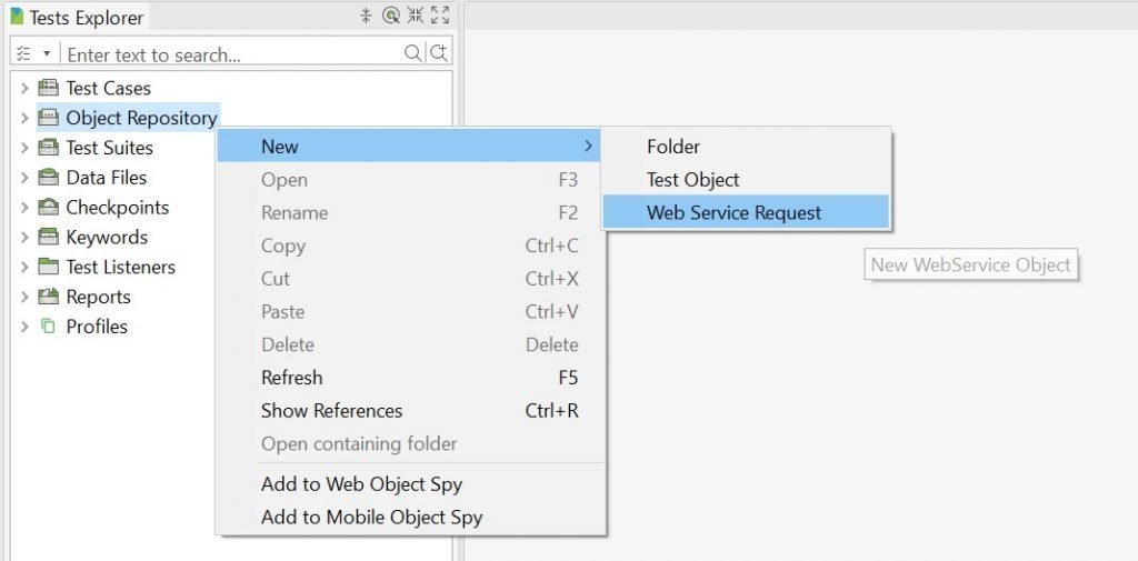 3. Now, right click on “Object Repository” directory icon and click on ‘New’ -> “Web Service Request”