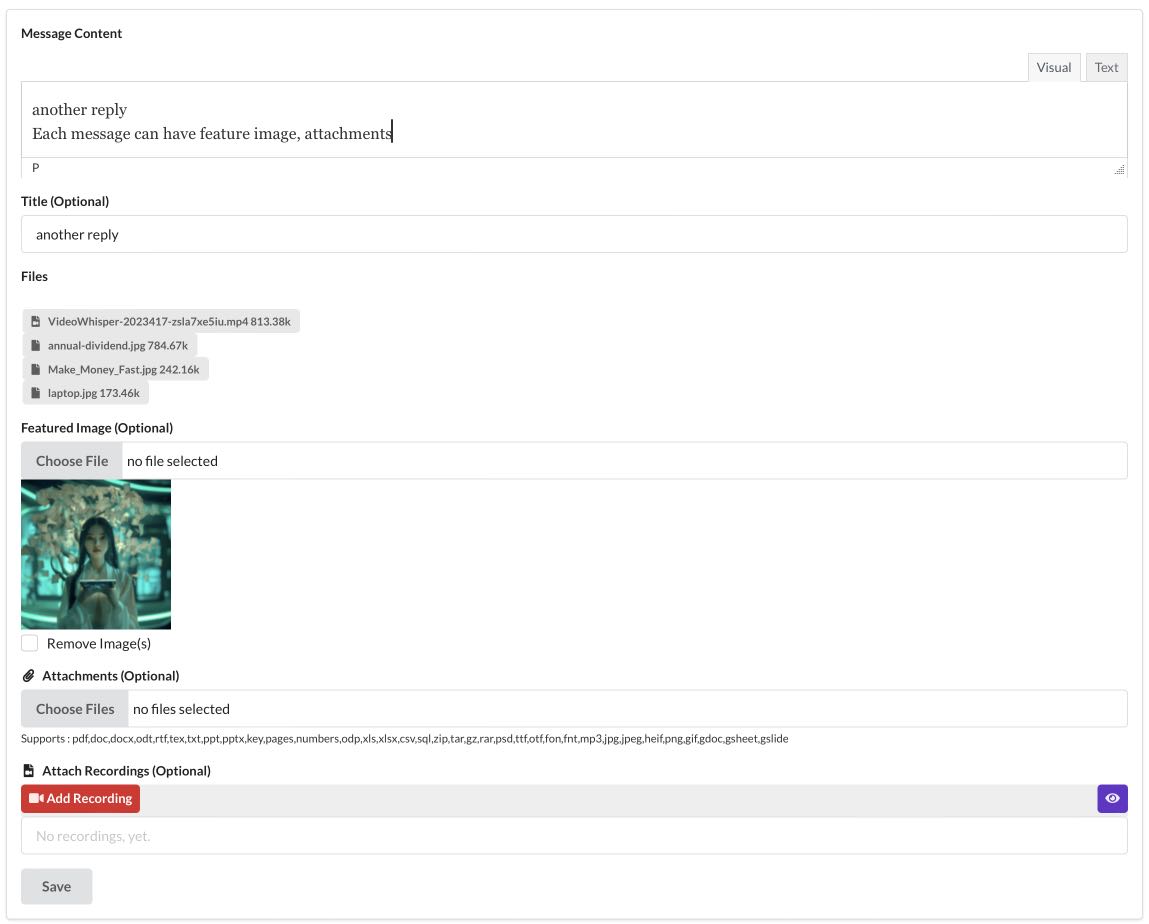 Message Edit: messages can have thumbnails, attachments, video/audio/screen recordings