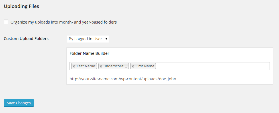Organize file uploads by File Type (mov, gif, png, mp3…) and Logged in user (nickname, first-name, last-name…).