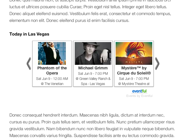 Now Showing at Local Venues displays a slideshow of upcoming events w/ photos & details for any location. Just type in your location and show events based on keyword, radius, date, category, popularity and/or relevancy.