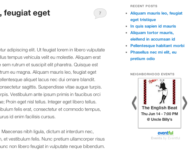 - Use the plugin’s shortcode [nearby-events] in the content of your pages and posts or in a Text widget in your theme’s sidebars. The shortcode will use all defaults specified on the Now Showing at Local Venues Settings Page, unless further parameters are passed through the shortcode, such as [nearby-events location=”Las Vegas” sort=”popularity” visible=”1″] or any other combination of fields described on the settings page.