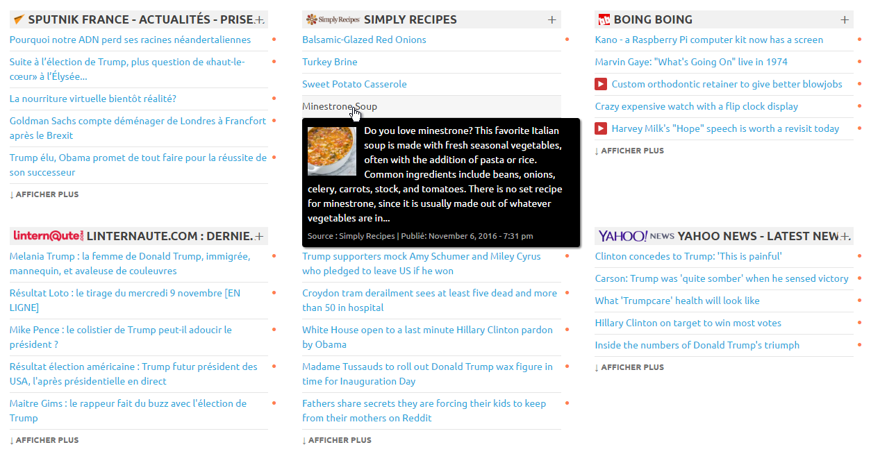 Pro version with Favicons and Videos icons. Show more/Show less feeds, Show descriptions and images on hover. see more and the Minimize and Maximize +/- buttons to reveal the description. Find and play Youtube Videos, MP4 Videos, MP3 podcast with the MP3 and Video Player.