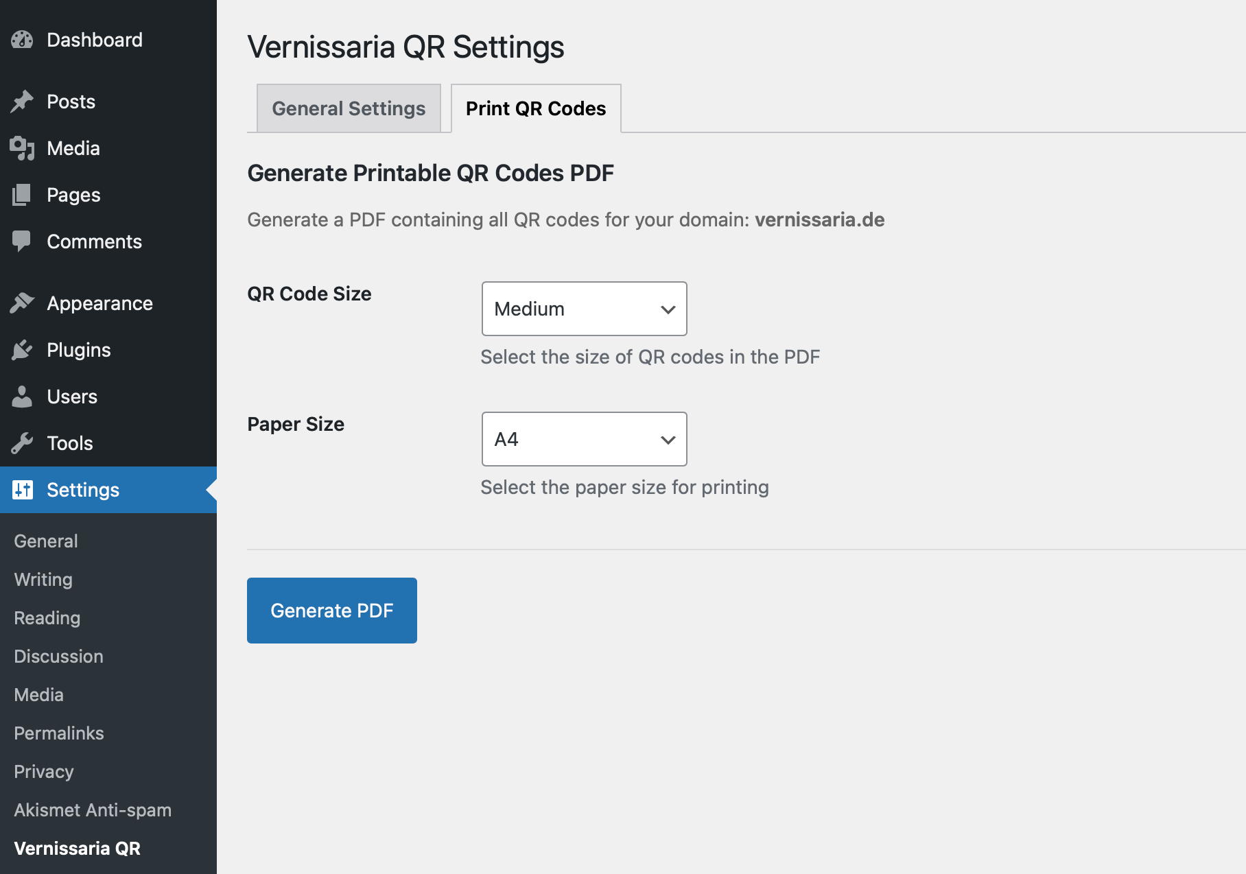 Go to Settings Vernissaria QR Print QR Codes tab. Select your preferred QR size and paper format, then click “Generate PDF” to create a printable document with all your QR codes.