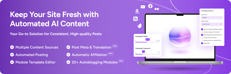 Content Pilot – Autoblogging & Affiliate Marketing Suite automatically posts content from various sources based on predefined keywords. It helps you to create high-quality WordPress blog posts and automatically inject your affiliate link.