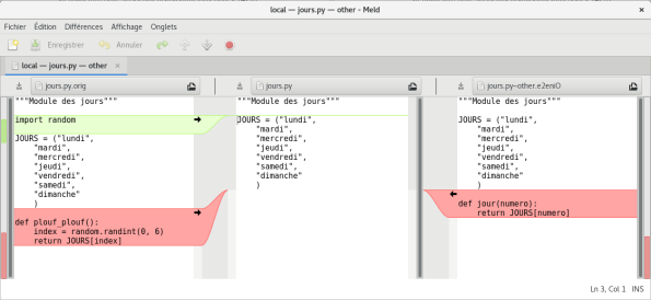 Meld est un équivalent graphique de `diff` : il permet de faire des différences entre des fichiers de manière plus visuelle. Mercurial peut utiliser `meld` plutôt que l’outil par défaut lorsqu’il faut afficher des différences entre les fichiers du dépôt local et les fichier du dépôt distant.