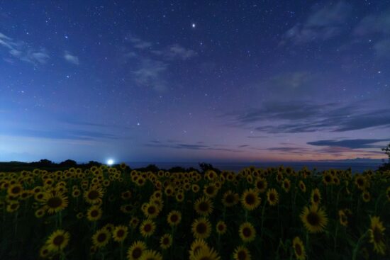 今回私が訪れたのは、ペルセウス座流星群が極大日を迎える 2023 年8月のお盆のころでした。事前の天気予報では、全国的に雲が広がりやすい天気で、少しでも晴れ間が望めそうな佐渡島への遠征を急遽決めました。事前の下調べで、ちょうどお盆の頃にひまわりが見頃を迎えるとのことで、ひまわりと星の撮影を候補にしつつ、ライフワークである灯台と星の撮影をするべく沢崎鼻灯台でも撮影を行いましたので、その模様をご紹介したいと思います。