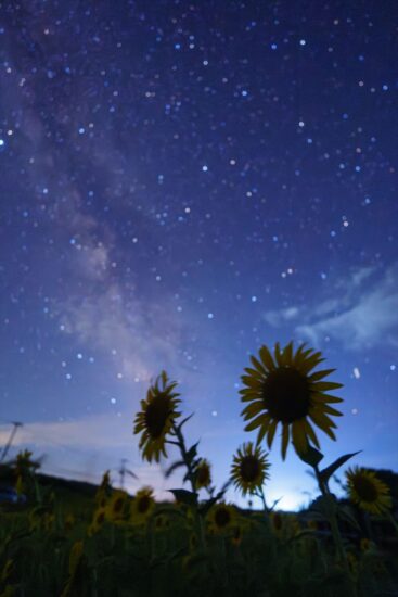 夕日が沈むとポツポツと星が現れてきたため、星空とひまわりの撮影も行いましたが、佐渡一周道路のすぐそばということもあり車の往来が激しく、車のヘッドライトの明かりを気にしながらの撮影になりました。通常の星景撮影ならば問題ありませんが、タイムラプスなどは光の点滅が激しくなるため不向きかもしれません。撮影した時間は日没後すぐということもあり、西の空に沈む春の大三角形をテーマに撮影を行いました(写真3)。ひまわりの高さは、胸の高さくらいのものから腰あたりのものと様々で、色々アングルを変えながら撮影することができます。今回、道路沿いの電線や電柱が写らないようにローアングルを主体に撮影を行いました(写真4)。