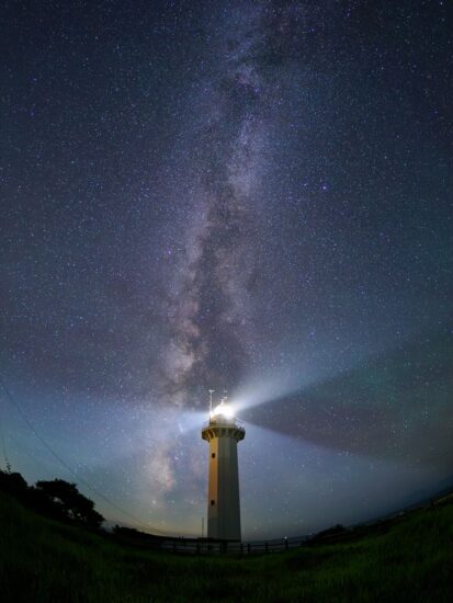 沢崎鼻灯台はフレネルレンズの回転式灯台で、30秒間の間に2回白く光ります。星景写真で撮影しようとすると明かり部分は白く飛んでしまいますが、背後の空の暗さと写る星の量を見ると佐渡島の空の暗さを痛感します(写真6)。