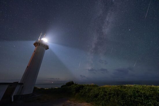今回はペルセウス座流星群の極大日前夜ということで、インターバル撮影で流れ星を狙って撮影を行いましたが、1時間ほどの撮影でもこれだけ多くの流星を撮影することができました(写真7)。沢崎鼻灯台には駐車場がないため、少し手前にある深浦駐車場に停めてから徒歩で行くか、短時間の滞在であれば灯台入り口を過ぎてすぐ左手にある車寄せに停めて行くのがよいでしょう。