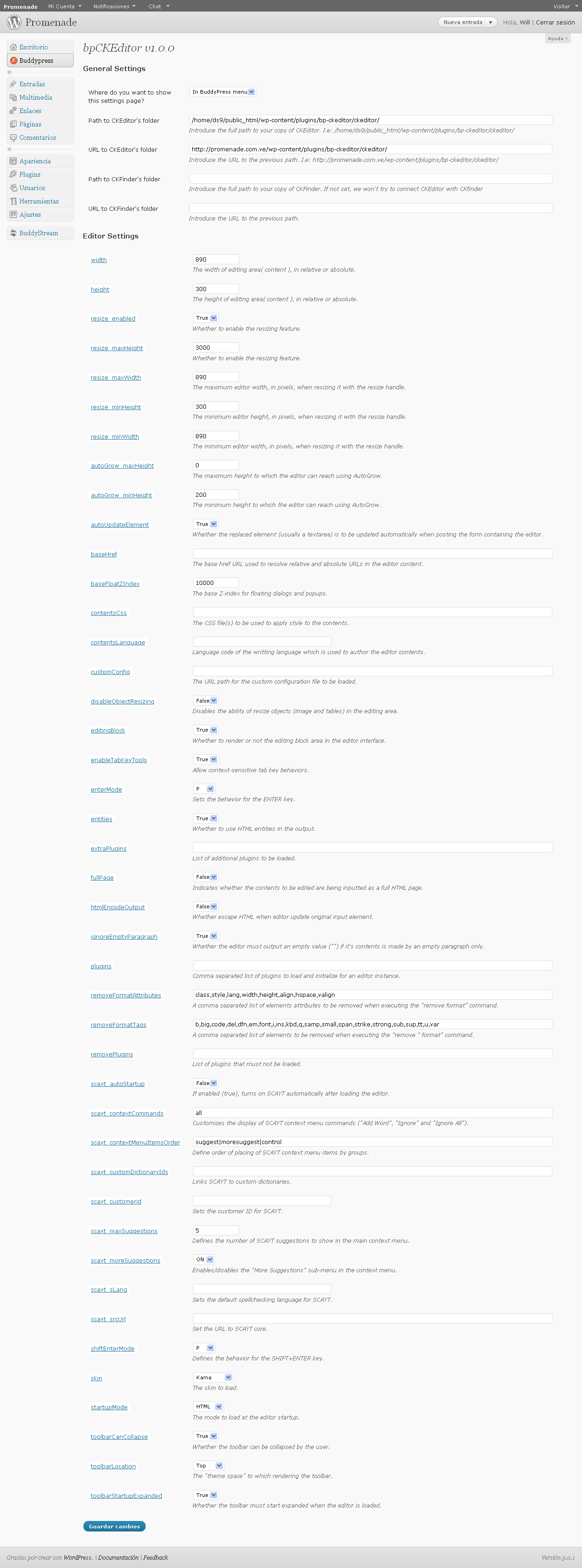 3. Configure the plugin (Buddypress -> bpCKEditor by default) by entering the paths to CKEditor and the settings of the editor itself.