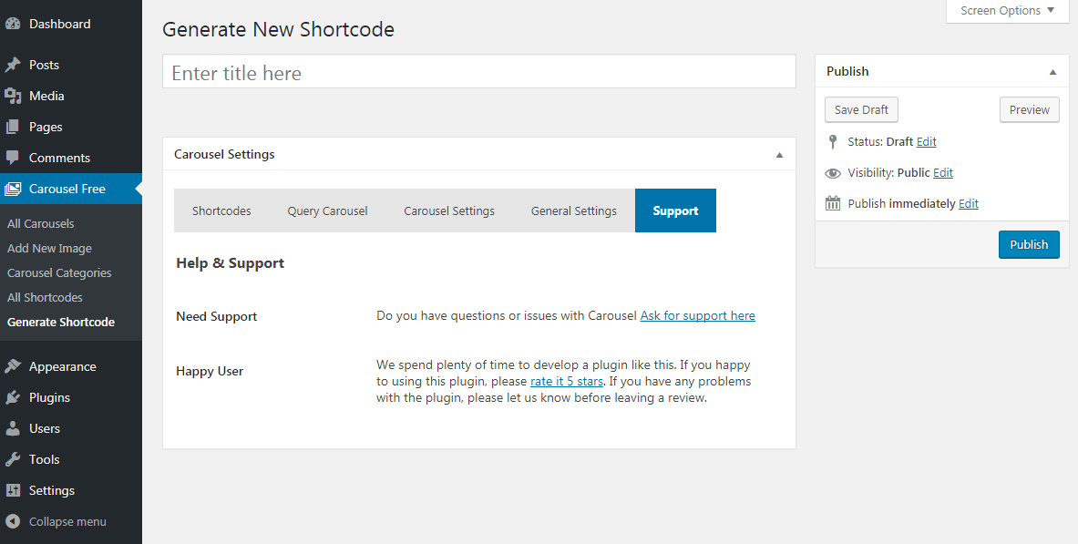 - Go to Carousel Free > Generate Shortcode > Select Post Type post & select post categories. now publish Shortcode. copy the shortcode and paste it into your post, page or widgets section.