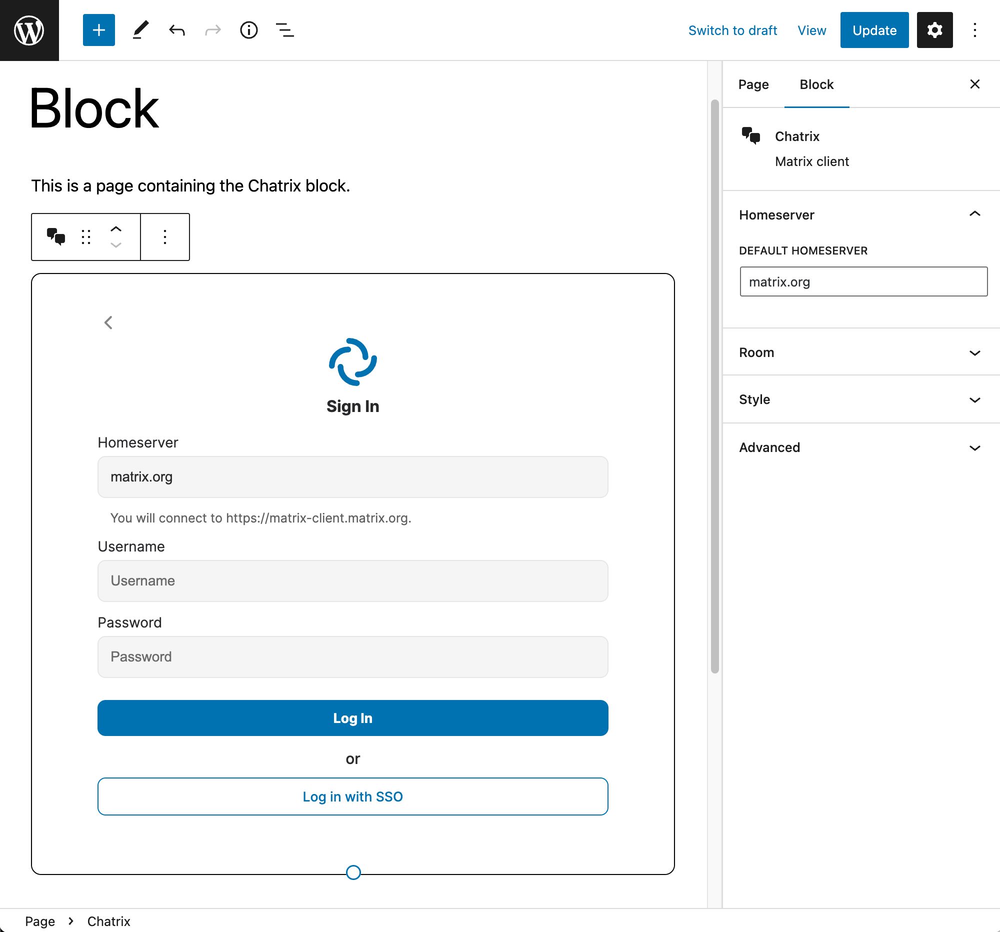 Easily add a Matrix client to WordPress pages, either through the Block Editor, or as a popup.
