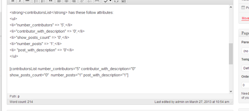 ( the name of the new file must be custom-style.css ) - Edit the shortcode [contributorsList], now it accepts the following attributes: number_contributors, contributor_with_description, show_posts_count, number_posts, post_with_description