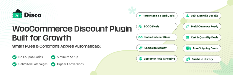 Disco is a complete WooCommerce discount rules plugin that automatically applies percentage discounts and fixed discounts based on conditions you define. Unlike coupon codes that customers must find and enter manually, Disco discount rules activate instantly when shoppers meet your criteria. No codes to distribute, no codes to forget.