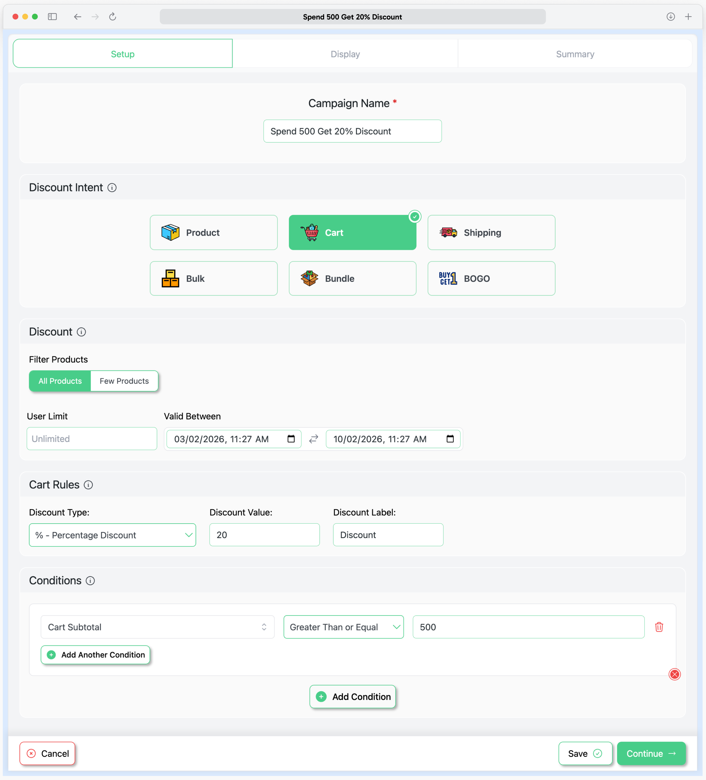 Disco supports six distinct discount campaign types, each designed for different promotional strategies. You can run multiple campaigns simultaneously to create sophisticated promotional programs.